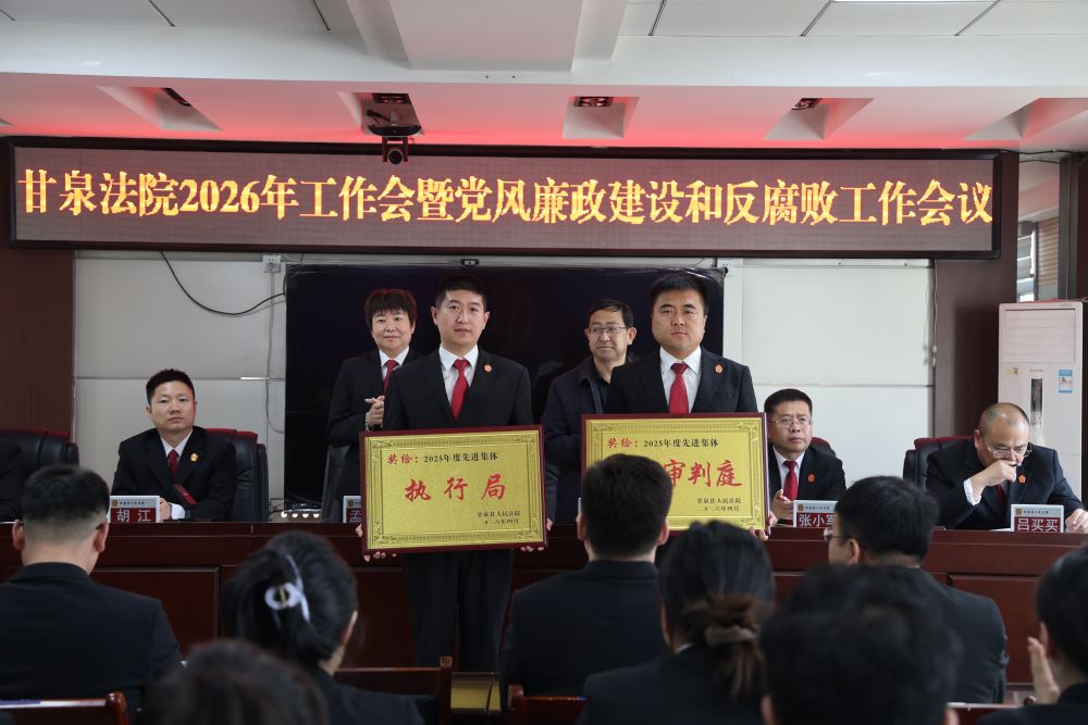 会议传达学习了习近平总书记对政法工作的指示批示精神、中省市县政法工作会议精神、全国全省全市法院工作会议精神,宣读了甘泉法院表彰决定。邱哲组长对甘泉法院党风廉政建设和反腐败工作提出了具体要求,孟晓宜全面回顾了甘泉法院2025年工作,并重点对2026年工作作动员部署讲话。