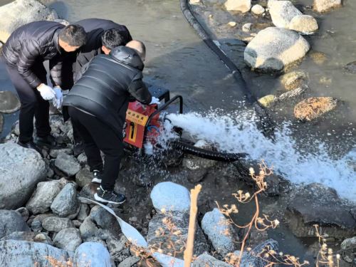 图为2月26日佛坪县袁家庄街道干部李华良、熊栋在帮助肖家庄村20亩油菜抽水“春灌”,现场指导油菜春季管理。(李先刚供图)