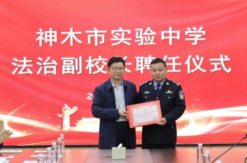 随后举行了隆重的法治副校长聘任仪式。由陈斌校长为大柳塔公安分局副局长杨杰同志颁发神木市实验中学法治副校长聘任证书。