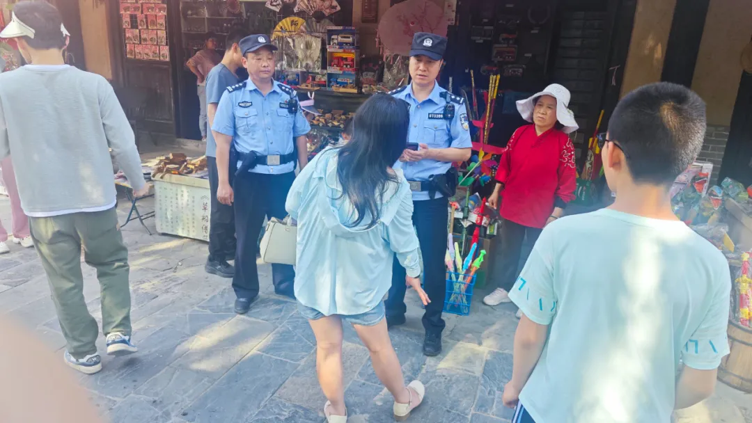 接警后,民警火速联动景区安保成立搜寻组,沿美食街、文创市集、亲子游乐区展开“地毯式”搜寻,调取重点区域监控视频实时追踪,并通过广播系统循环播放寻人启事。经过1小时争分夺秒的排查,最终在青舍客栈旁找到了走失男童。见到孩子安然无恙,母亲激动得连连道谢:“要不是你们及时帮忙,我真不知道该怎么办!”