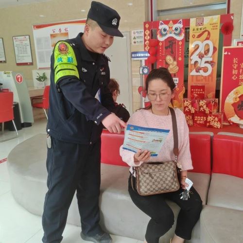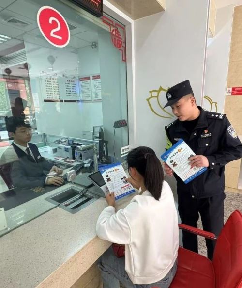 社区民警对电信网络诈骗案件深入开展综合梳理,聚焦高发类案、多发警情,分析“跟跑”新型套路,从拦截、预警、劝阻等多方面综合施策,增强防范工作的实效性。4月22日组织民警深入辖区银行网点、各单位服务窗口等,在营业大厅、ATM存取款机等醒目位置,张贴防诈骗宣传标语,在客户等候区针对老年人、家庭主妇等高危群体,民警设计“反诈测试题”,让居民现场识破骗术,并发放反诈宣传彩页和“反诈口诀卡”,手把手指导群众安装使用“国家反诈中心APP”的预警功能。