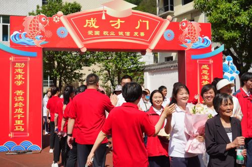 全体学生在家长的带领下,精神抖擞地走过成长门,迈过成人门,步伐整齐、目光坚定地来到成才门,与门后相迎的校领导与老师们击掌。