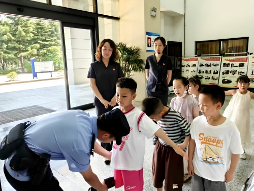 “法警叔叔,你们是怎样保护爸爸妈妈的?”孩子们在法警的带领下参观体验安检入口,通过对各类警用器械的作用和使用方法进行了解和演练,进一步提高了安全意识和自我防范能力。
