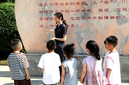 “有没有小朋友知道石雕上刻的是什么字呀……”法官干警通过趣味讲解,向孩子们介绍法院广场石雕上古体“灋”、獬豸等法院文化元素的象征意义。孩子们认真聆听,稚嫩的童声诵读着法治标语,展现出对法律世界的好奇与向往。