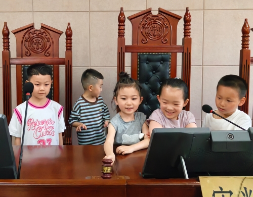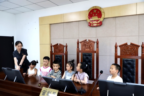 在审判法庭,法官干警详细介绍了法徽、法槌及审判席等法庭基本配置,小朋友们争先恐后走上审判台,敲响法槌,亲身体验“小法官”,“零距离”感受司法审判的神圣和威严。