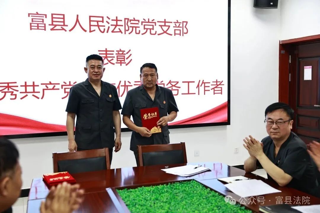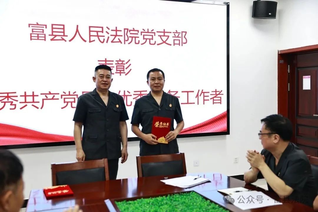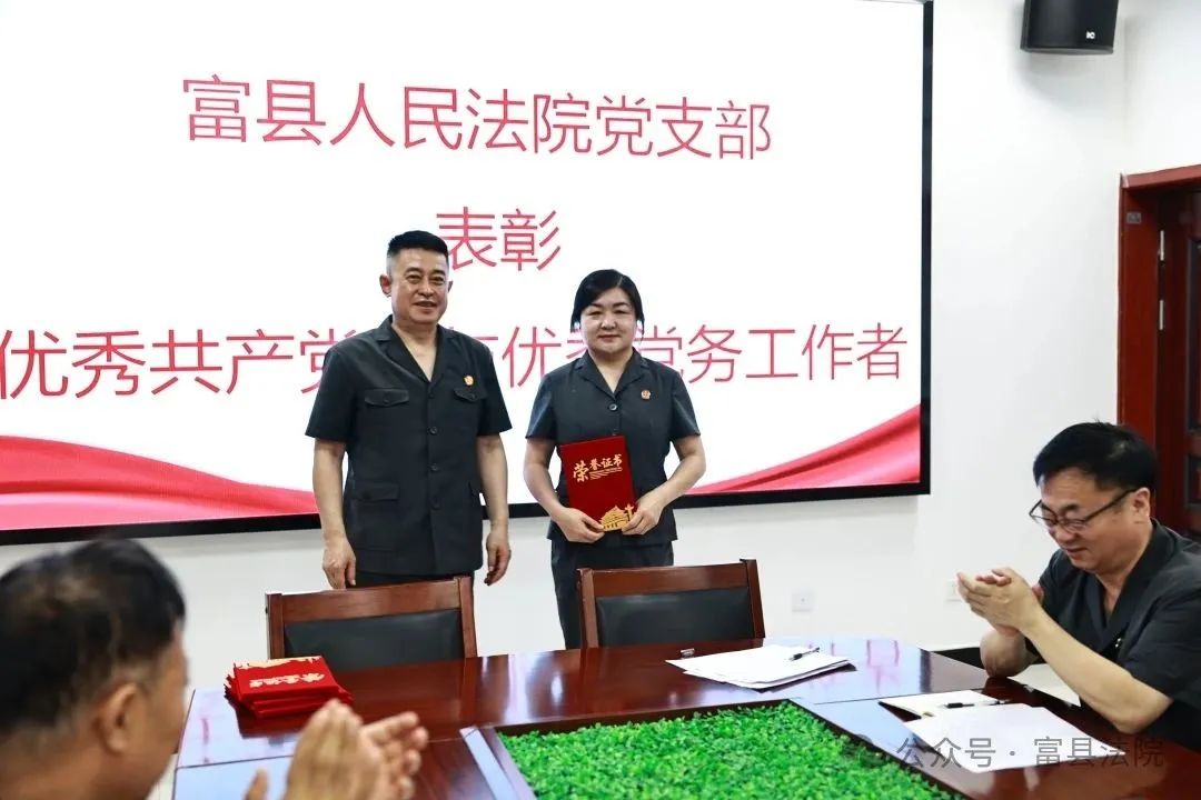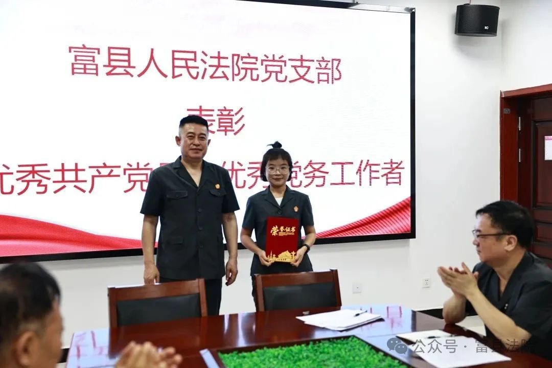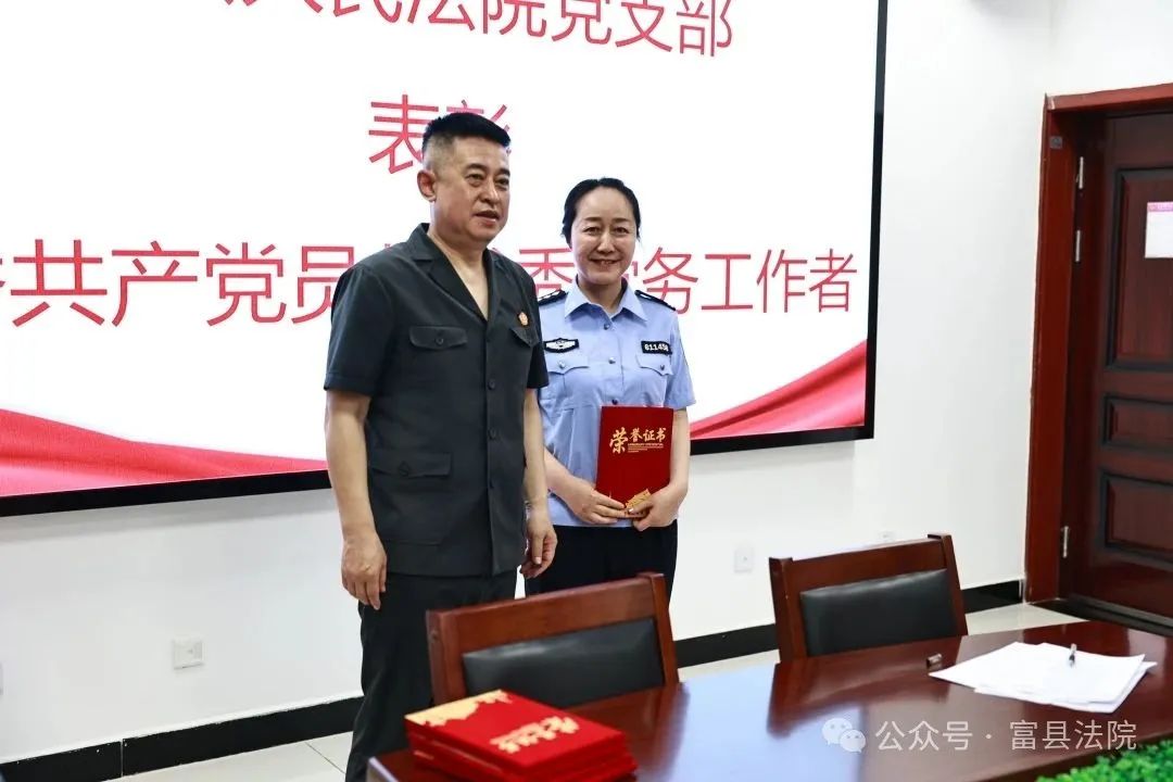为进一步营造学习先进、争当模范的浓厚氛围,院党组书记、院长闫俊为受表彰的优秀共产党员白朝霞、陈东旭等6人颁发了荣誉证书。他们是全院党员干警身边的标杆,生动诠释了共产党员的先锋模范作用,展现了新时代法院干警忠于职守、担当作为、清正廉洁的良好风貌。榜样的力量,激励着在场每一位党员对标看齐,在各自岗位上勇创佳绩。