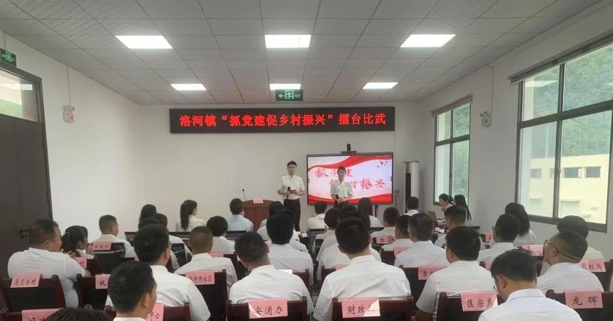 为庆祝中国共产党成立104周年,推进深入贯彻中央八项规定精神学习教育,落实“干部作风提升年”工作要求,充分发挥村(社区)党组织书记、第一书记、青年干部在乡村振兴中的作用,6月30日,平利县洛河镇以“抓党建促乡村振兴”为主题,精心谋划,周密部署,举办了党支部书记、第一书记、镇青年干部擂台比武活动,在家镇领导班子成员,各村(社区)党支部书记、乡建公司党支部副书记、驻村第一书记,各中心、办所负责人,镇青年干部等70余人参加。