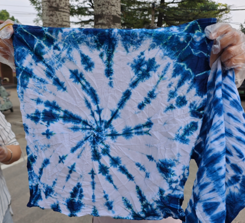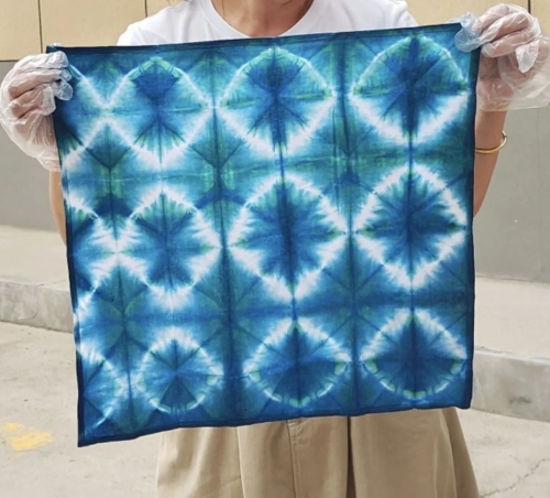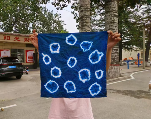 活动现场,非遗传承人王变芳老师首先向学员们介绍了扎染的原理和扎染的多种技法,现场展示了多款精美染扎作品,示范了扎染的制作过程及操作要领,带领大家感受这项古老技艺的独特魅力。在王老师的悉心指导下,大家纷纷动手实践,运用各种扎结方法,如麻花染、竹节染、旋风染等扎紧方巾,精心挑选染料上色。经过捆扎、浸染、氧化、拆解等工序,一块块素白棉布逐渐呈现出蓝白相间的独特纹样,色彩斑斓、独具创意的方巾惊艳呈现,大家纷纷为自己的作品欣喜不已。