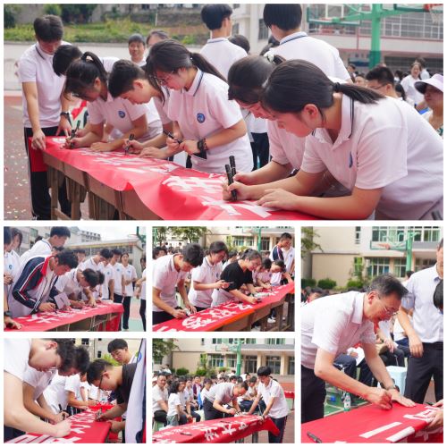 青春无悔动员会上,两位校长共同为高考倒计时牌揭幕。鲜红数字映入眼帘,紧迫感与使命感油然而生。七位班主任接过“高考战旗”,挥舞间凝聚起班级向心力。各班学生依次宣誓,“高考必胜”的呐喊响彻校园。“我要上中山大学!”“我要上西安交大!”“我要上陕西师范大学”......理想宣言环节,学子们登台喊出心中目标,声震云霄,掌声雷动。亲子共书约定时,一张张卡片传递着期许与承诺,温情与力量在会场流淌。最后,校领导、师生在各班冲刺横幅上郑重签名,将誓言镌刻成日常的动力。