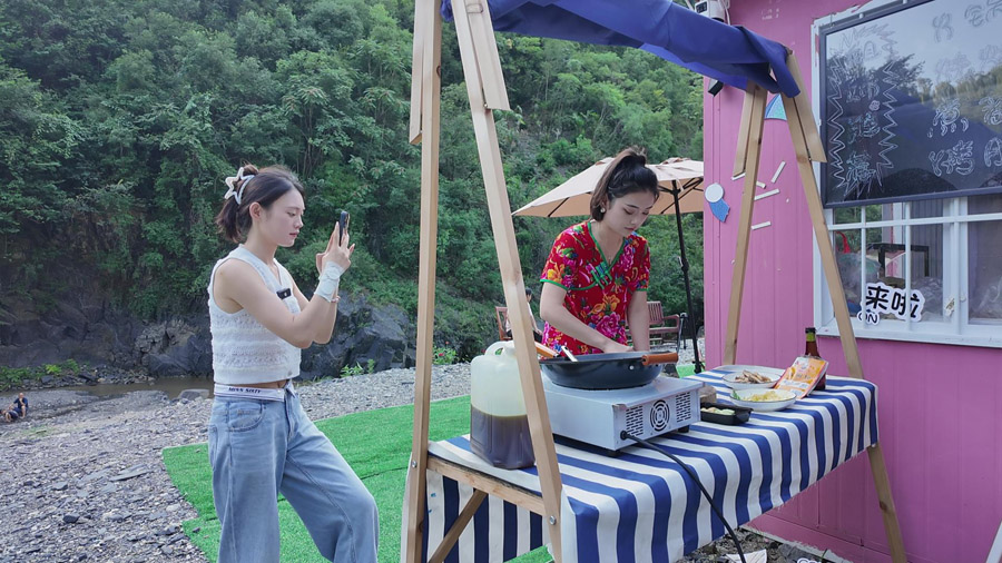 随着乡村旅游的火热,越来越多返乡创业的年轻人也主动加入进来,他们通过短视频、直播等形式,真诚地分享家乡的风土人情与山水美景,让自己成为连接乡土与外界的“网红”,以鲜活的视觉语言吸引更多游子返回家乡、更多游客来到家乡。刘欢、刘丹姐妹俩就是这股潮流中的积极参与者,在她们新开的集装箱餐饮店,妹妹刘丹在灶前烹饪特色家乡菜,姐姐刘欢则用镜头记录下烟火缭绕中的家乡风味。姐妹俩还经常联手直播,将七里峡最本真的山水之美,生动地展现在全国网友面前。