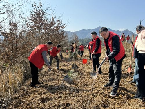 春风轻拂,植树现场一派热火朝天。正式植树前,经验丰富的同事细致讲解要点:“树苗入坑要先扶正,填土踩实后再浇透水,这样根系才能扎得稳。”大家认真聆听,随后分工协作,挥锹铲土、扶苗填坑、踩实浇水,每个环节都一丝不苟。干部们三两成组,默契配合,干劲十足。原本空旷的土地上,一株株树苗被稳稳栽种,黄褐色的枝干挺立向阳,错落有致地勾勒出蓬勃的生命轮廓,尽显春日劳动的鲜活气息。经过一上午的辛勤劳动,一株株新苗整齐挺立在田间地头,为春日的乡村增添了盎然生机与绿色活力。